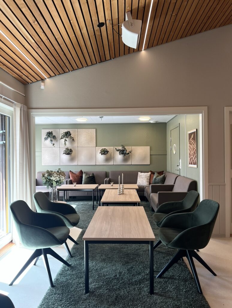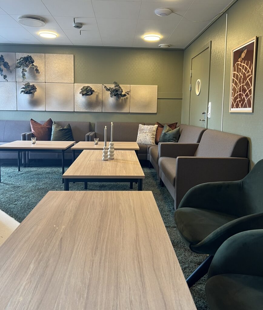 Vi tok utgangspunkt i behovene til brukerne av folkehelsehuset – fra sosiale samlinger til avslapning og arrangementer. Løsningen inkluderte bedre belysning, varmere fargevalg og en mer funksjonell møblering som enkelt kan tilpasses ulike situasjoner.